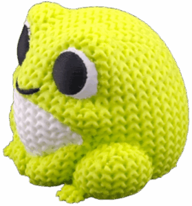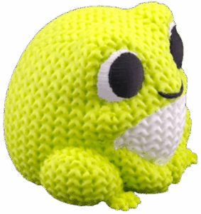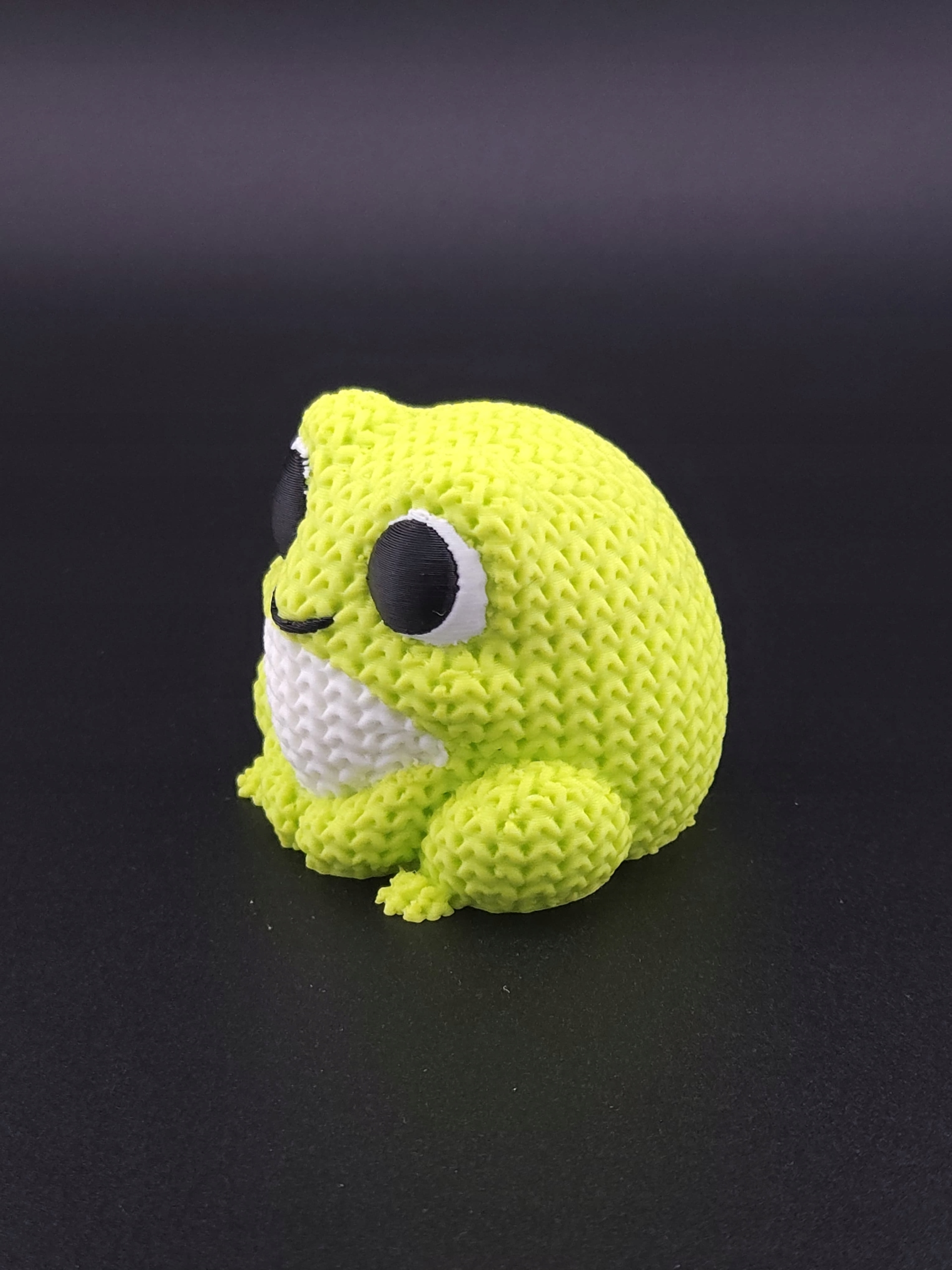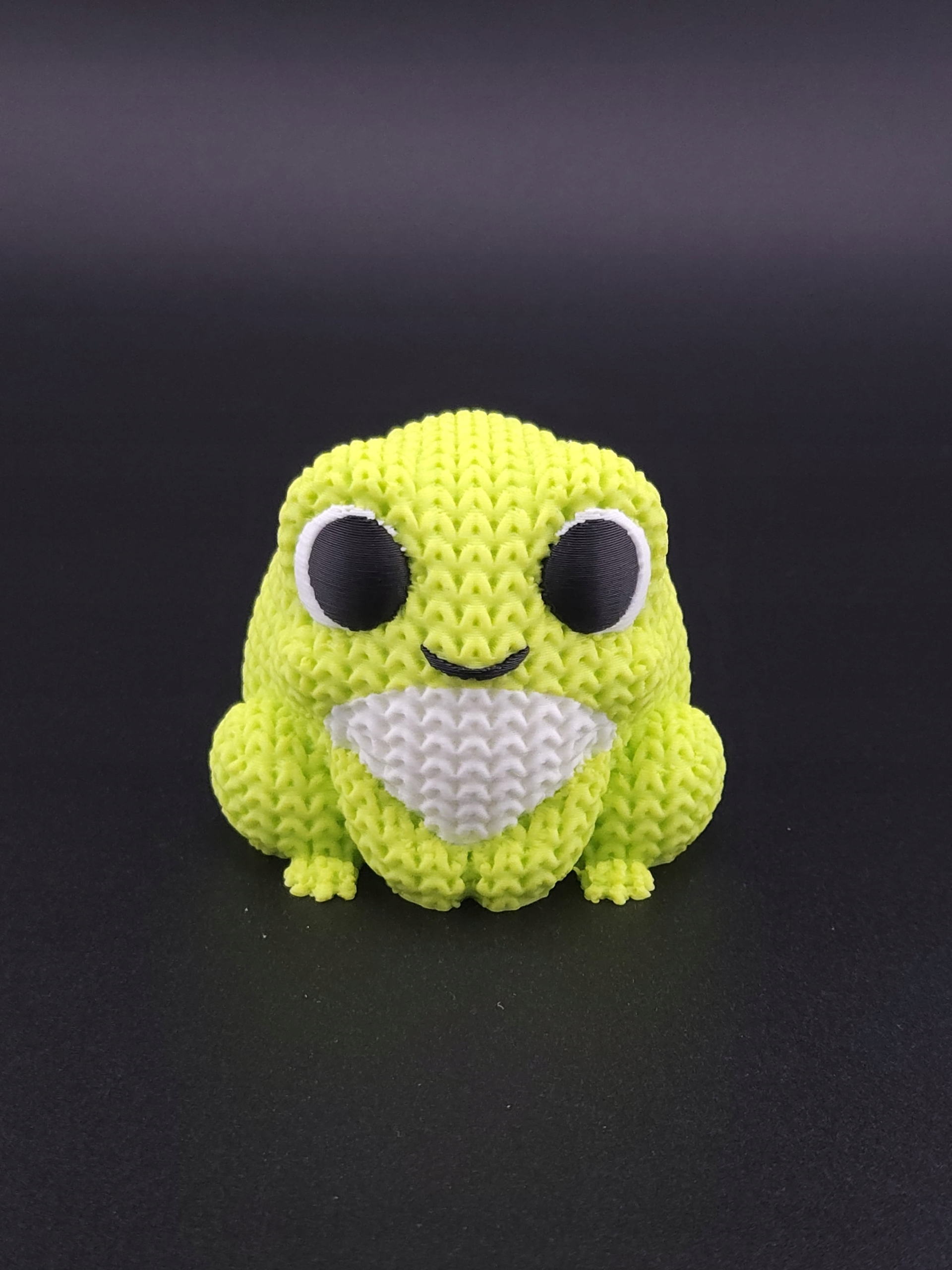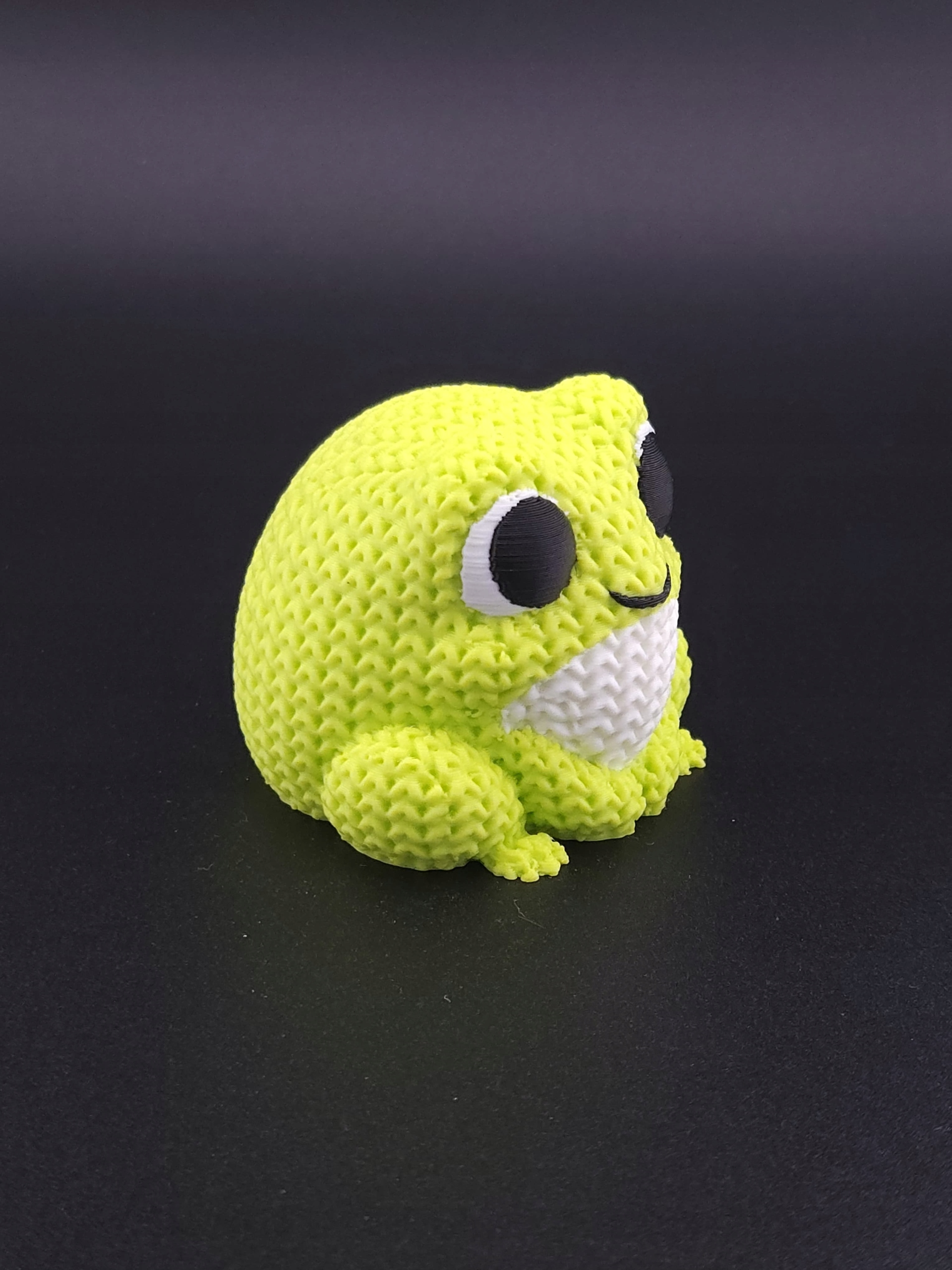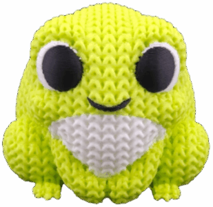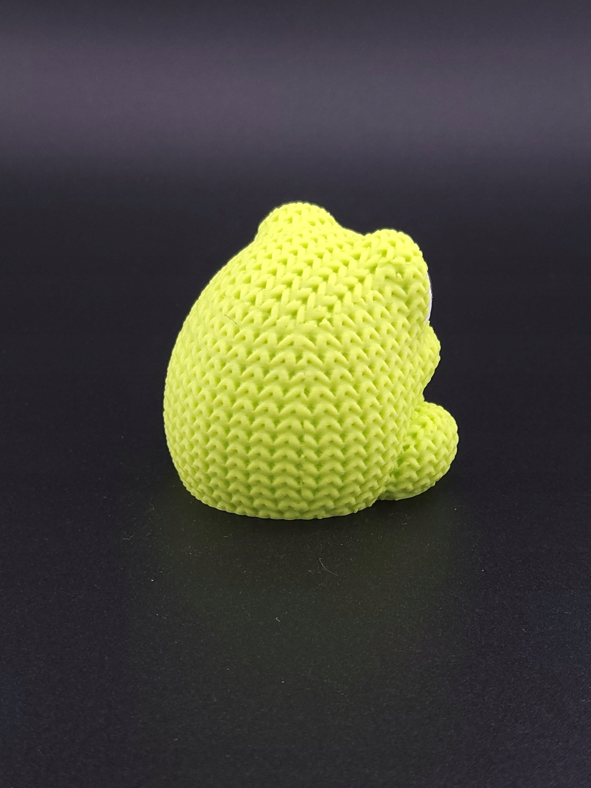 Kompaktowa figurka żabki wykonana z trwałego, ekologicznego PLA, zachwycająca „dzianą” fakturą przypominającą robótkę na drutach.